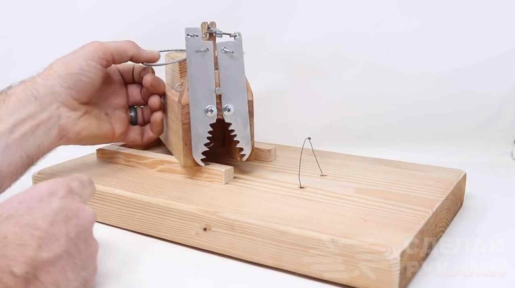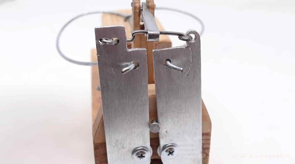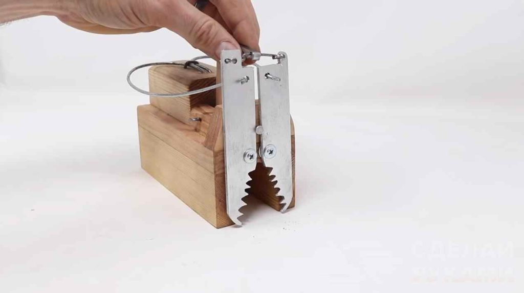 Далее можно приступать к сборке мышеловки. При помощи саморезов крепим металлические пластины с зубьями, потом устанавливаем два отрезка стальной проволоки, а также делаем «замок», который будет держать пластины во взведенном состоянии.