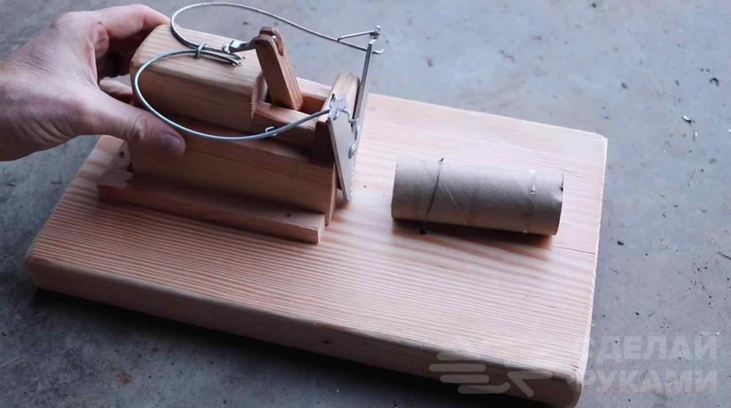 Собранную конструкцию устанавливаем на основание и фиксируем при помощи деревянных реек. Дополнительно автор устанавливает кусок бумажной трубки — этот туннель направит мышь непосредственно к приманке.