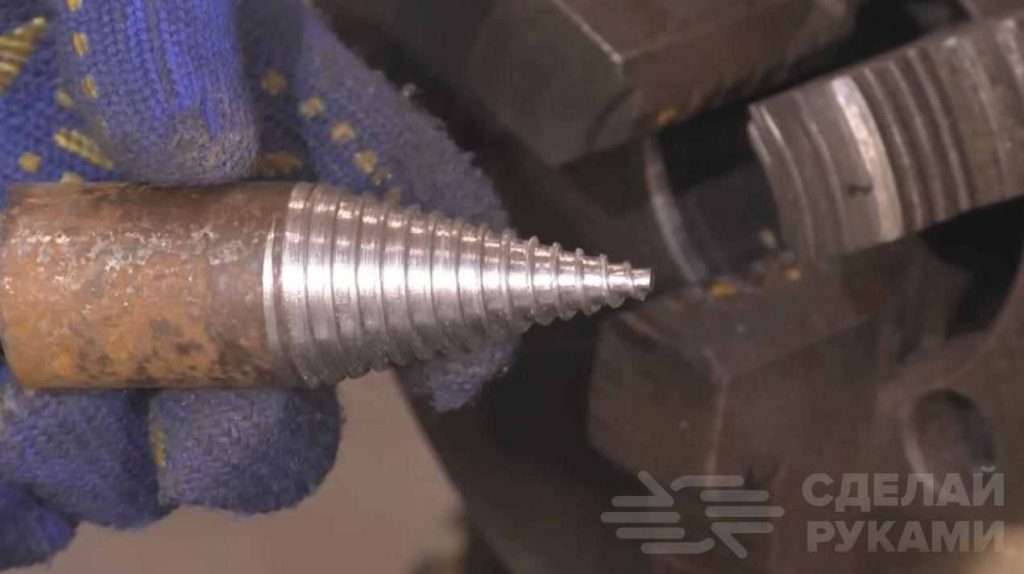 На следующем этапе необходимо нарезать на конусе резьбу. Эту операцию автор тоже выполняет на токарном станке, используя обратный резец.