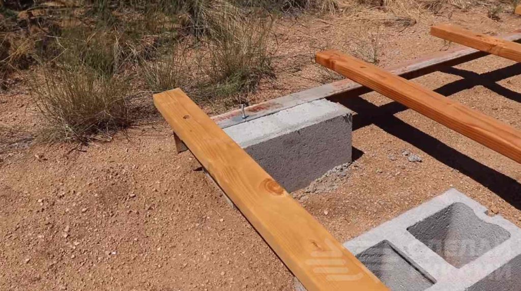 К крайним и центральным блокам в каждом ряду автор крепит металлический уголок. Сверху крепится уже обрешетка из деревянных брусков или досок.