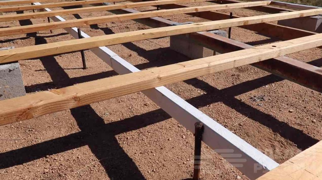 Далее автор устанавливает в три ряда опорные «точки» из шлакоблоков. В каждом ряду по 5 блоков.