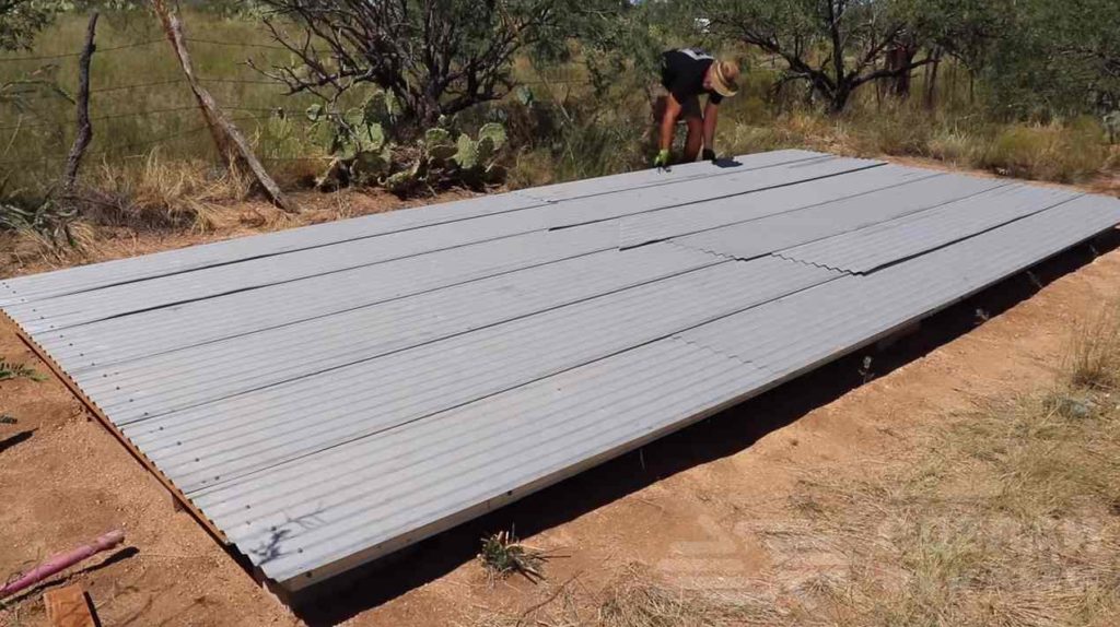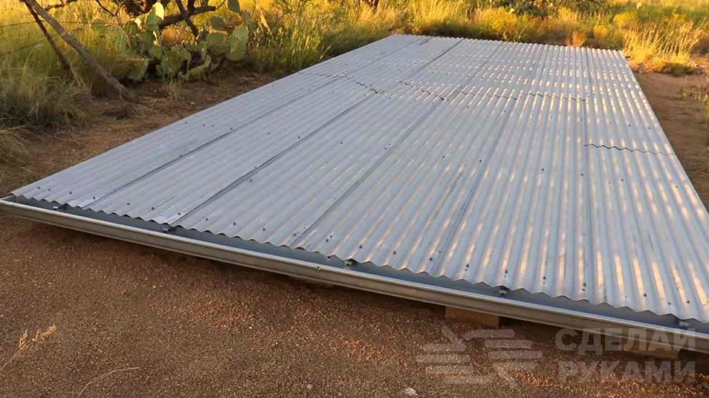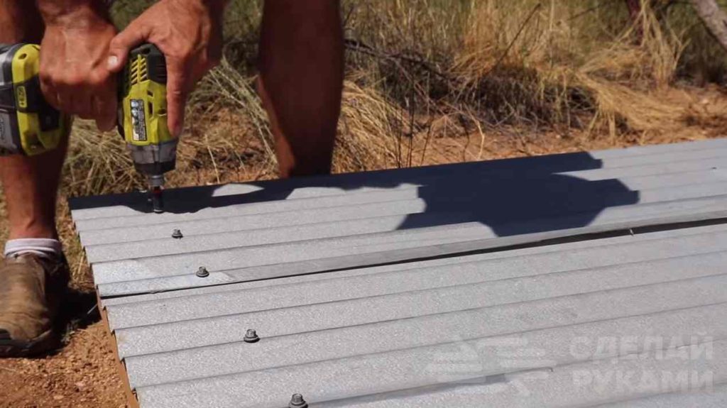 Затем можно приступать к монтажу кровельного материала. В данном случае автор использует шиферные листы из оцинкованной стали. Но можно использовать и профлисты для кровли.