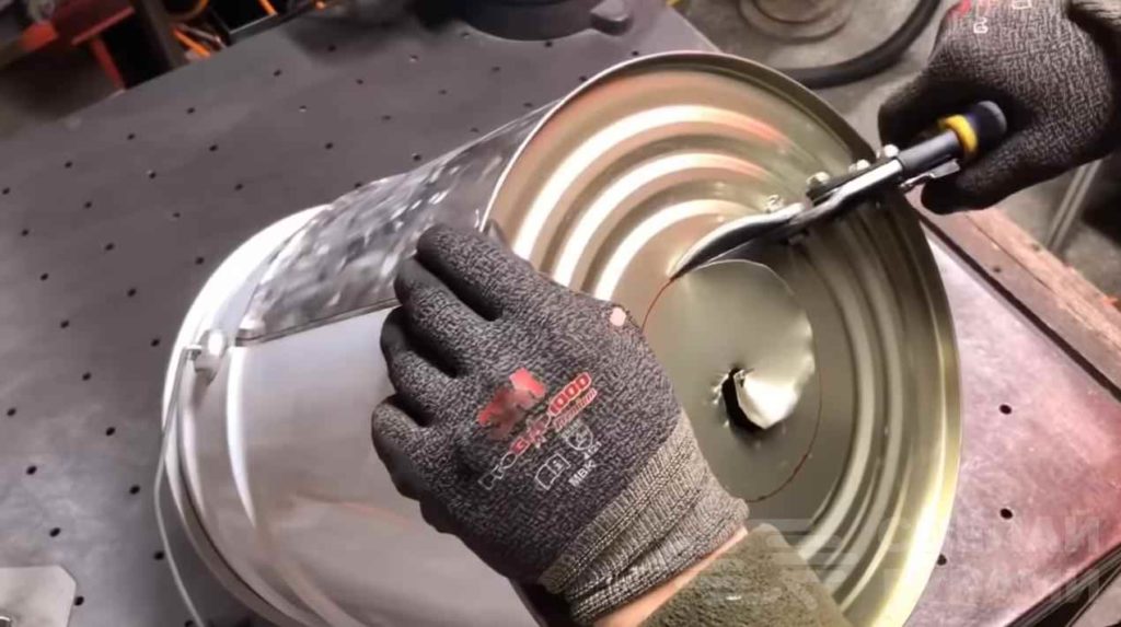На следующем этапе обводим на лекале диаметр трубы и переносим его на дно, крышку и боковую стенку ведра. Вырезаем все отверстия, согласно контурам. Продеваем тройник во все отверстия и прихватываем сваркой.