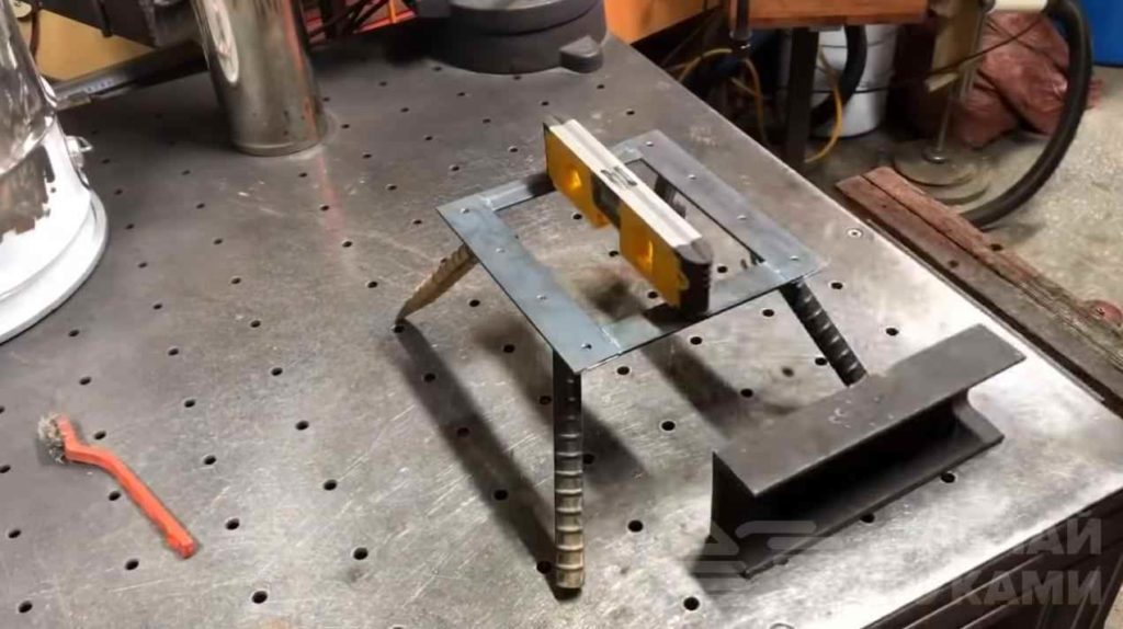 Нагреваем газовой горелкой и сгибаем их под 90 градусов. Рамку делаем из металлической полосы, сварив её квадратом. Привариваем на каждый угол наши куски арматуры и закрепляем всё на крышке ведра.