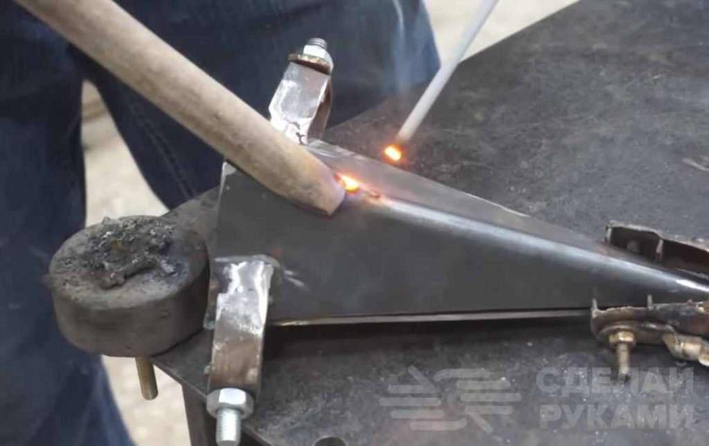 Также нужно приварить к «лопаткам» отрезки круглой трубы необходимой длины — это будут ручки приспособления. Их надо зачистить от ржавчины.