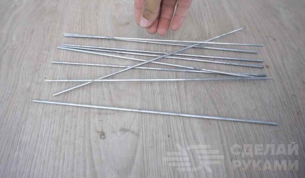 Первым делом необходимо будет отрезать десять заготовок из круглого прутка, каждая — длиной по 33 см. На одну «лапу» нужно по пять отрезков.