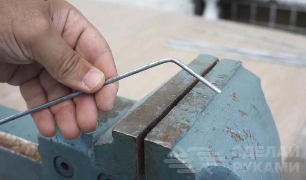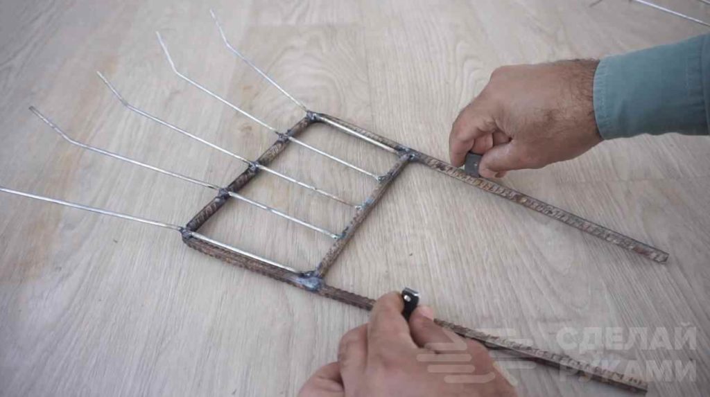 На следующем этапе конец каждой заготовки надо загнуть под углом примерно 45 градусов (как на обычных веерных граблях).