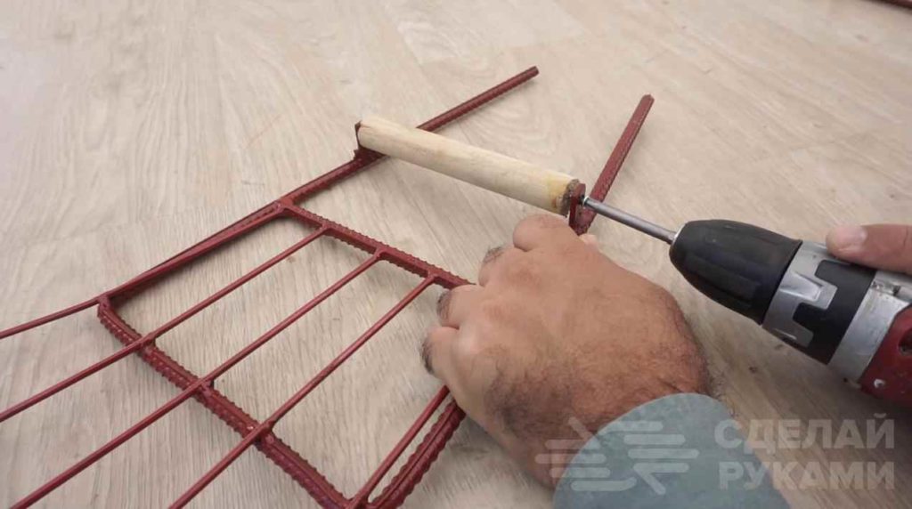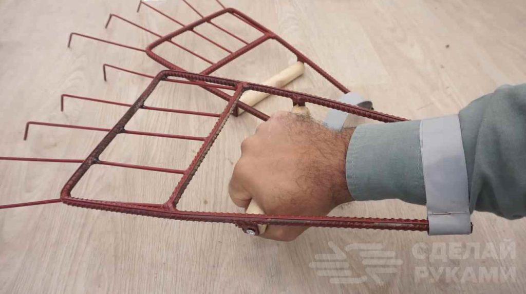Для изготовления «ручных» веерных граблей потребуются металлические прутки и куски арматуры. Также надо будет сделать две деревянные ручки.