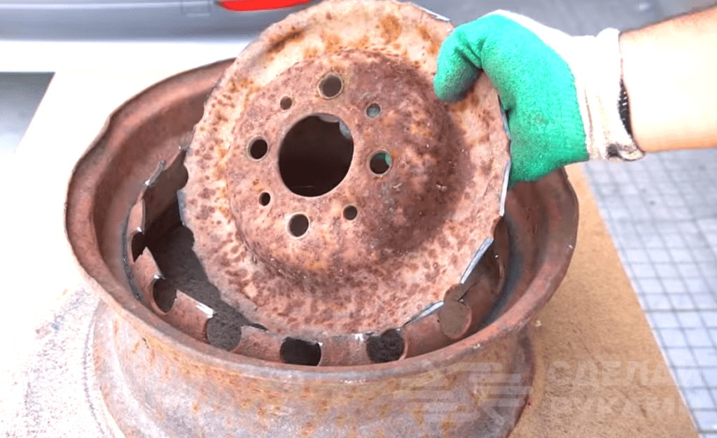 Первым делом при помощи болгарки вырезаем из обода внутреннюю часть. В самом диске также нужно будет вырезать выпуклую середину, чтобы в итоге получился «бублик». Края обрабатываем лепестковым шлифовальным кругом.