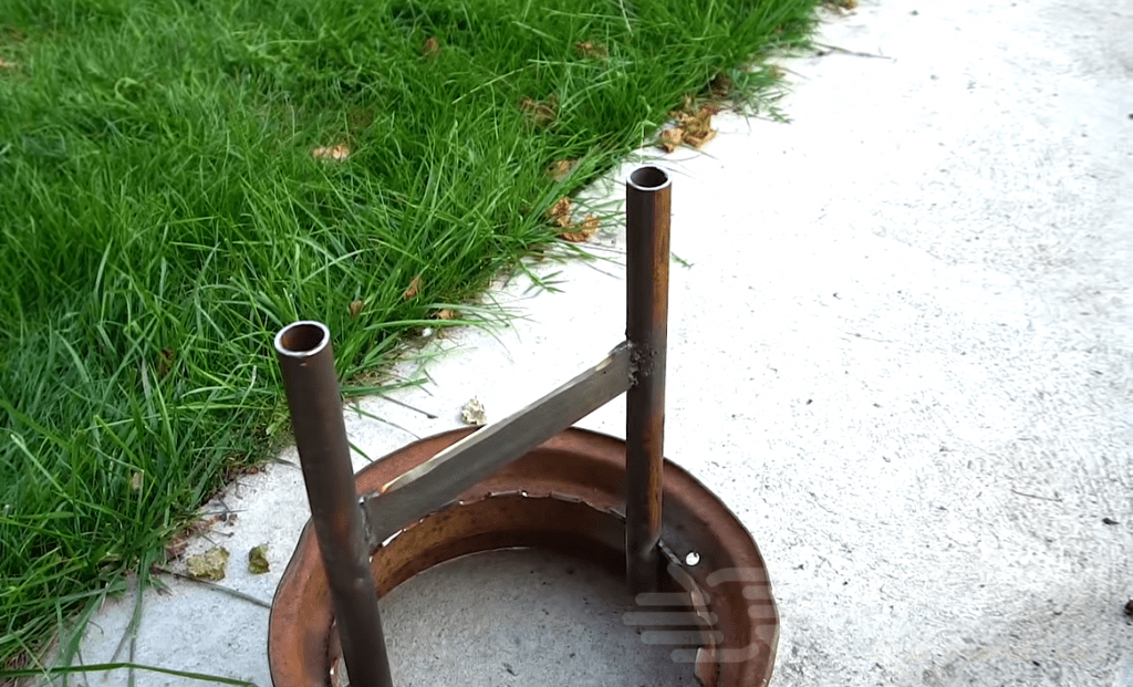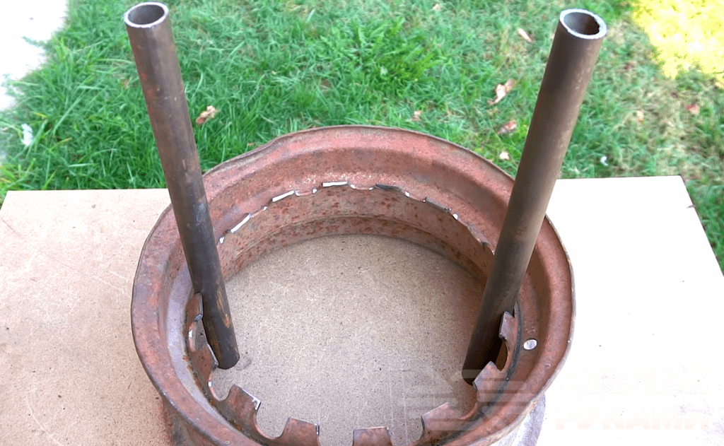 К ободу от колеса авто привариваем вертикально две стальные круглые трубы. Между ними (чуть выше середины) крепим самодельный нож, изготовленный из металлической пластины. Затем к верхнему краю труб привариваем ранее вырезанный «бублик».