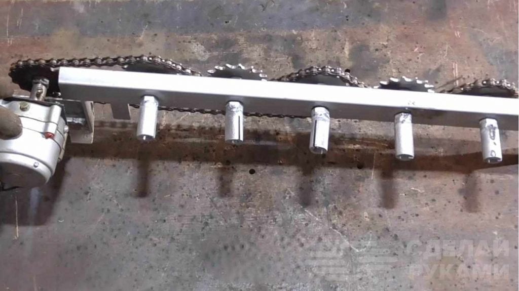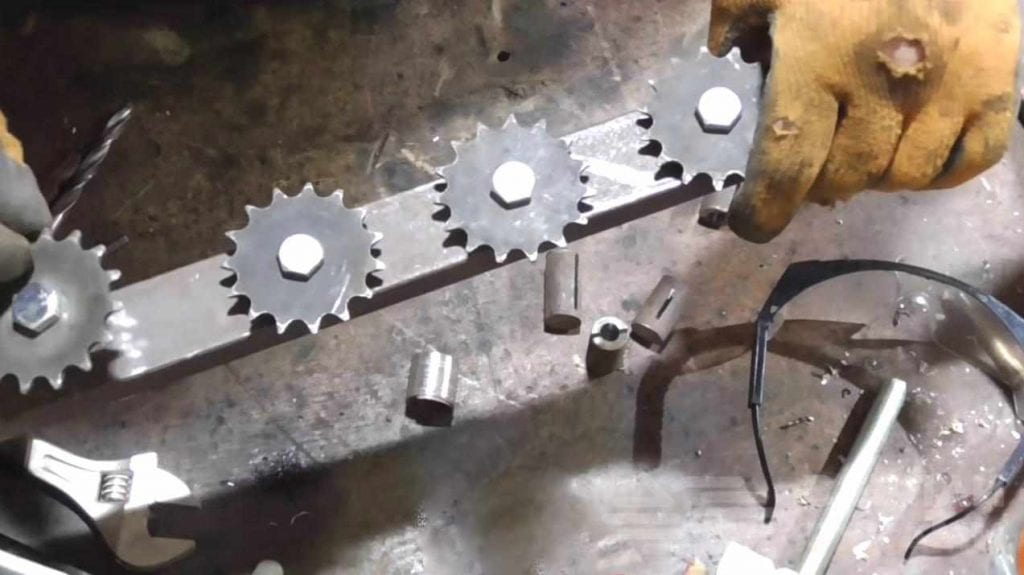 В качестве привода можно использовать моторчик, который приводит в действие автомобильные дворники. Цепь и звездочки можно взять от старого мотоцикла. Также эти шестеренки не составит проблем изготовить самостоятельно.