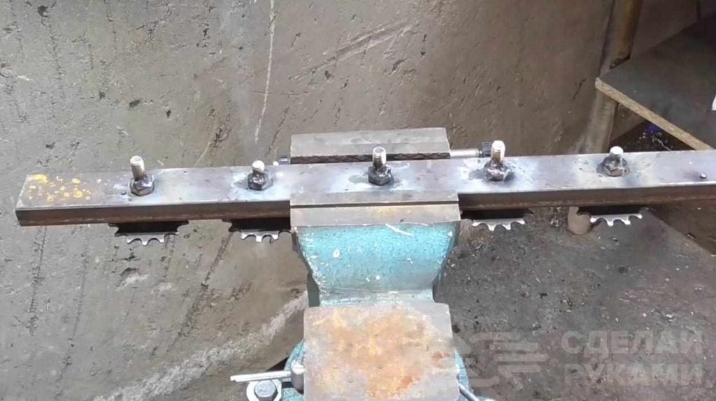 Крепления для самих шампуров можно изготовить из обычного стального прута. Отрезаем от него одинаковые куски длиной примерно по 5 мм и просверливаем в них отверстие для шампуров. Сверху делаем прорези для закладки шампуров. Привариваем крепления к окончанию болта.