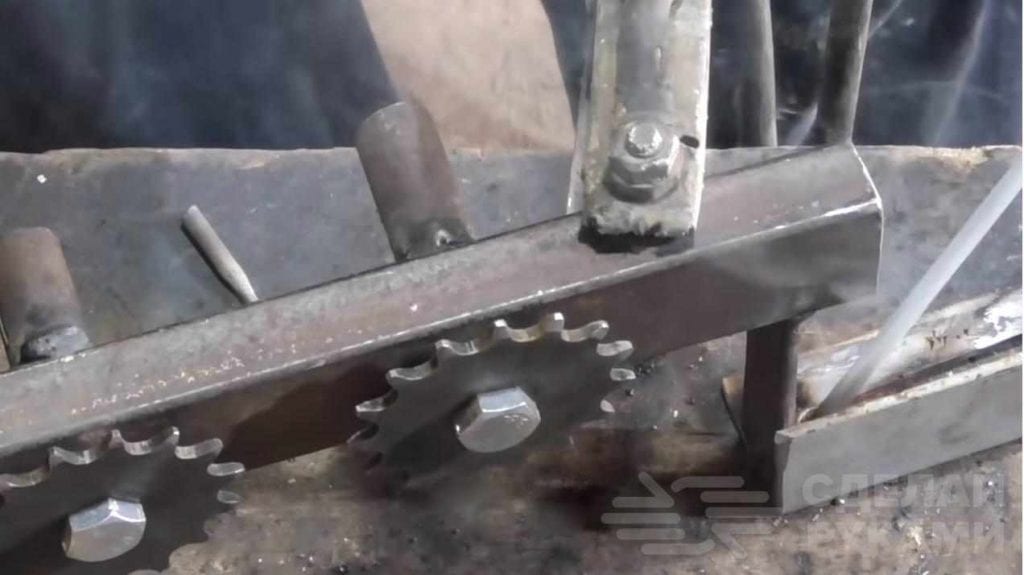 Натягиваем цепь на звёздочки. Закрепить электропривод к готовому мангалу можно разными способами. Самый простой это на всю длину мангала приварить две пластины к нашему каркасу и закрепить его. Так мы можем очень быстро демонтировать электропривод с мангала.