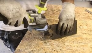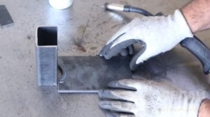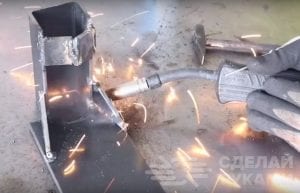С противоположной стороны к стенкам швеллера нужно приварить отрезки стальной полосы, расположенные немного под углом друг к другу. Для усиления конструкции к пластине и швеллеру привариваем два отрезка металла треугольной формы. После этого места соединения зачищаем шлифовальным диском для болгарки.
