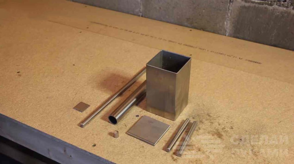 Для изготовления самодельного пресса потребуется кусок квадратной профильной трубы, круглая трубка, а также стальная квадратная пластина и круглый пруток. Первым делом отрезаем заготовки нужного размера.