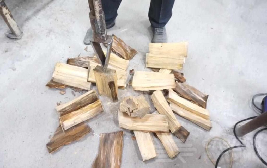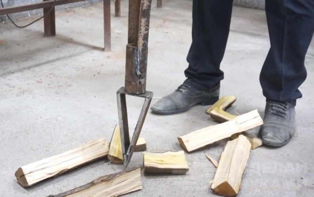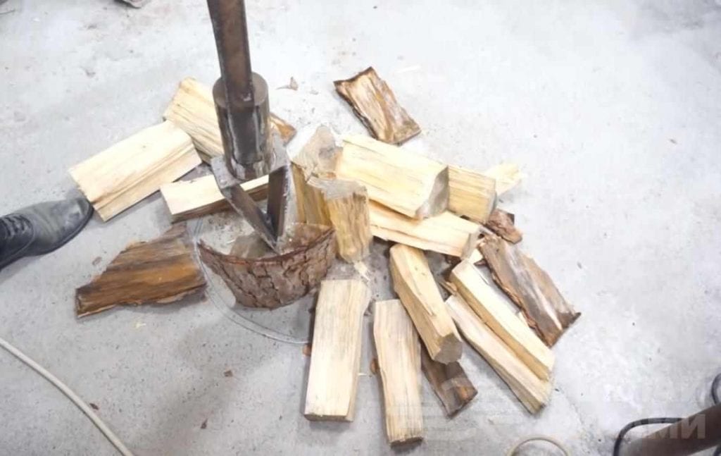 Под своим весом и при воздействии удара устройство легко раскалывает даже толстые чурки, и с легкостью справляется с мелкими поленьями. Работая такой самоделкой, затрачивается меньше времени, чем с топором или традиционным колуном.