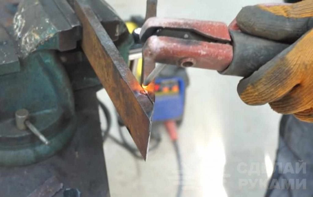 Для изготовления данной самоделки необходимо будет нарезать 3 куска полосы (2 длинных и 1 короткий). Нижние концы двух длинных заготовок нужно заточить таким образом, чтобы при их сваривании получилась острая часть.