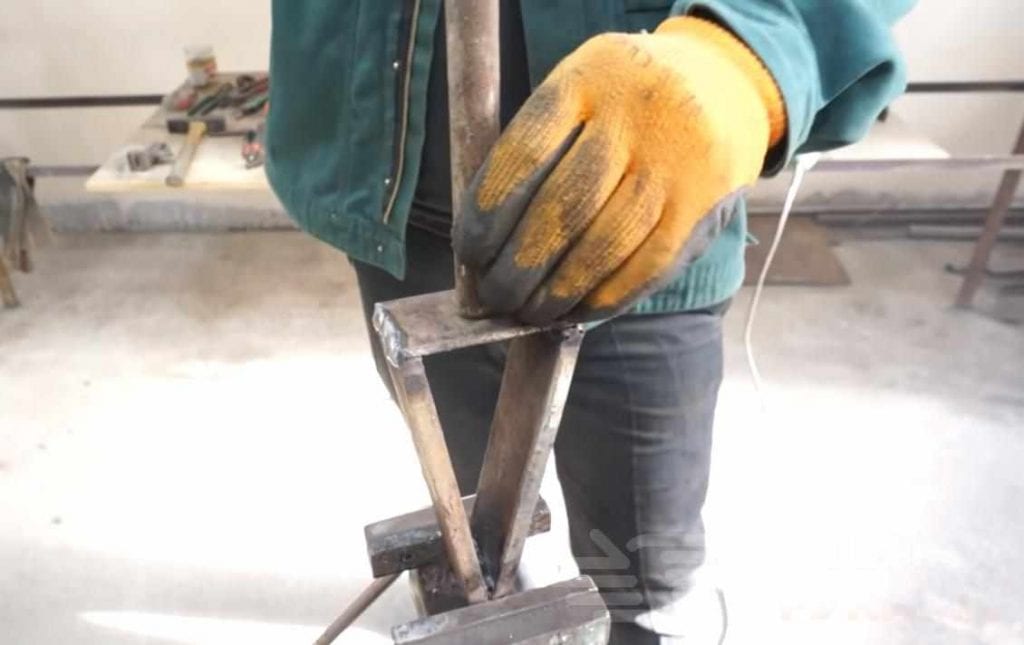 Сверху приваривается короткий кусок, который соединяет треугольник. К этому куску по центру приваривается прут с наваренной ограничительной втулкой. Между треугольником и самим ограничителем вставлена труба с ручками. Конструкция напоминает обратный молоток. Только труба в этом случае работает в прямом, а не обратном направлении.