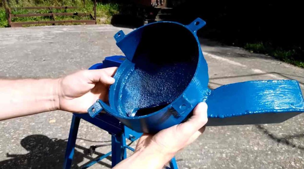 Корпус с приемным бункером, в который подаются ветки, изготовлен из металла, крепится к двигателю с помощью болтов.