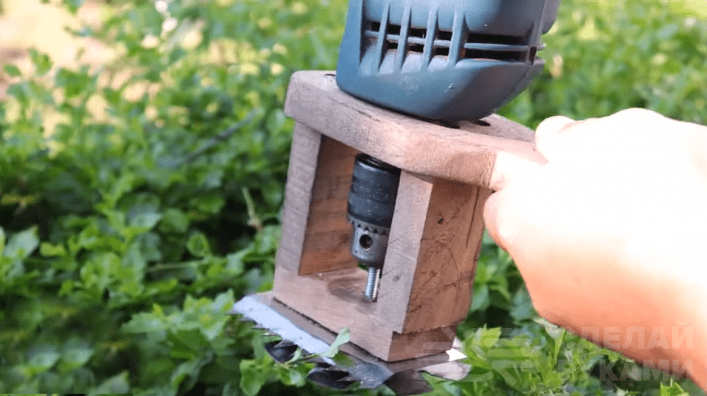 Для данной самоделки потребуется обычная бытовая электродрель средней мощности. Сначала необходимо из куска доски или фанеры вырезать ручку для кустореза. Она будет надеваться на «горловину» дрели. Для этого в заготовке нужно будет предварительно сделать круглое отверстие подходящего диаметра.