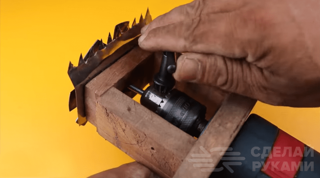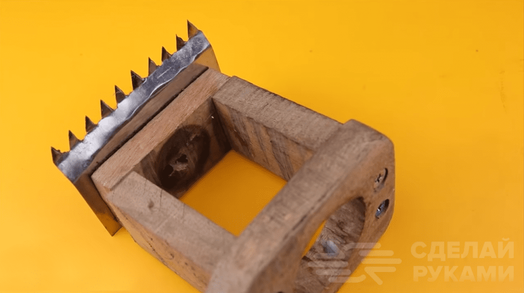Далее потребуется кусок листового металла. В первую очередь вырезаем прямоугольную пластину, на которой с одной стороны при помощи болгарки делаем режущие зубья. Получившуюся насадку крепим к деревянному каркасу.