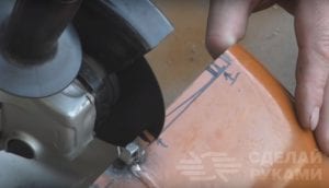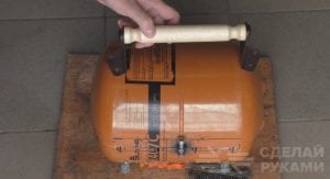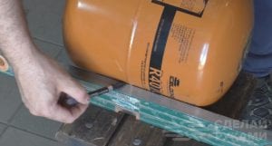Первым делом необходимо снять ручки на баллоне, высверлив контактную сварку при помощи электродрели, и срезать болгаркой вентиль. Далее надо разрезать металлический корпус на две половинки — для этого, используя маркер и строительный уровень, проводим ровную линию, затем наклеиваем по контуру малярный скотч, делаем разметку и разрезаем баллон болгаркой.