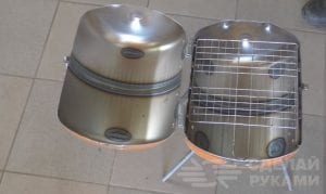 Делаем разметку на нижней половинке корпуса (с задней стороны) и сверлим четыре отверстия для шампуров на одинаковом расстоянии друг от друга. На лицевой стороне необходимо сделать четыре прорези. Затем сверлим воздушные отверстия в два ряда через каждые 4 см, отступив от края примерно 5–6 см.