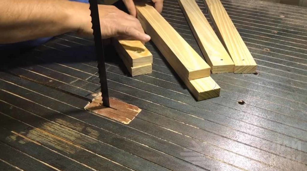 Первым делом автор делает разметку на заготовках, чтобы просверлить крепежные отверстия. Края на планках нужно закруглить. Автор просто обрезает их на ленточной пиле, но можно сделать это и на шлифовальном станке.