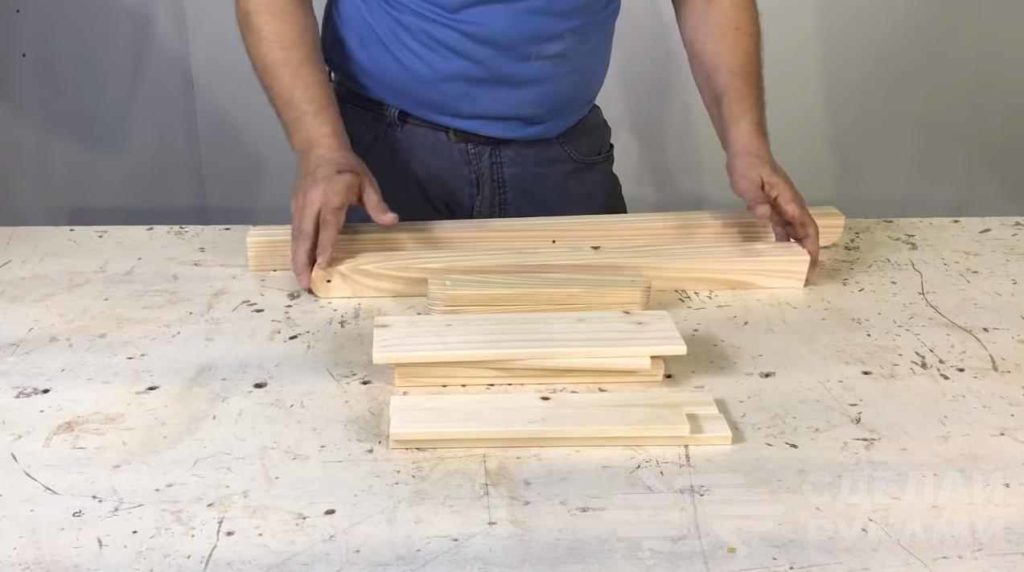 Также надо будет напилить две планки 30х3,5 см толщиной 12 мм, одну планку 26х3,5 см толщиной 12 мм и отрезать несколько дощечек: одну с размерами 30х8,5 см толщиной 12 мм и три — с размерами 26х8,5 см толщиной 12 мм.