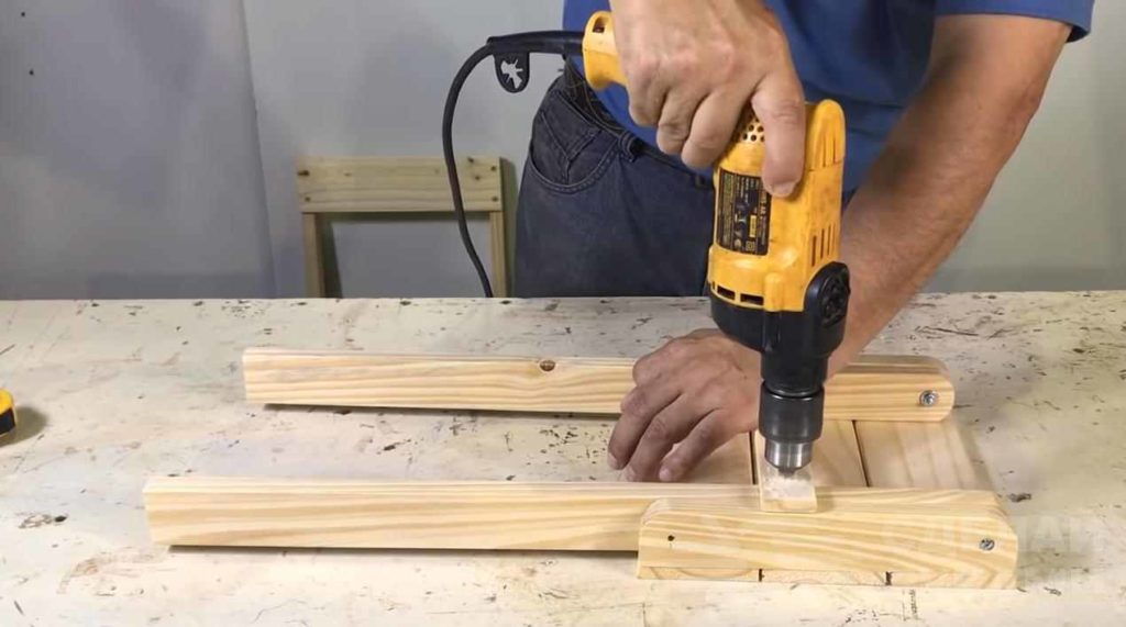 На следующем этапе можно приступать к сборке стульчика. Сначала автор собирает сиденье. Далее к сиденью крепятся на болты два бруска, которые автор соединяет с помощью планки.