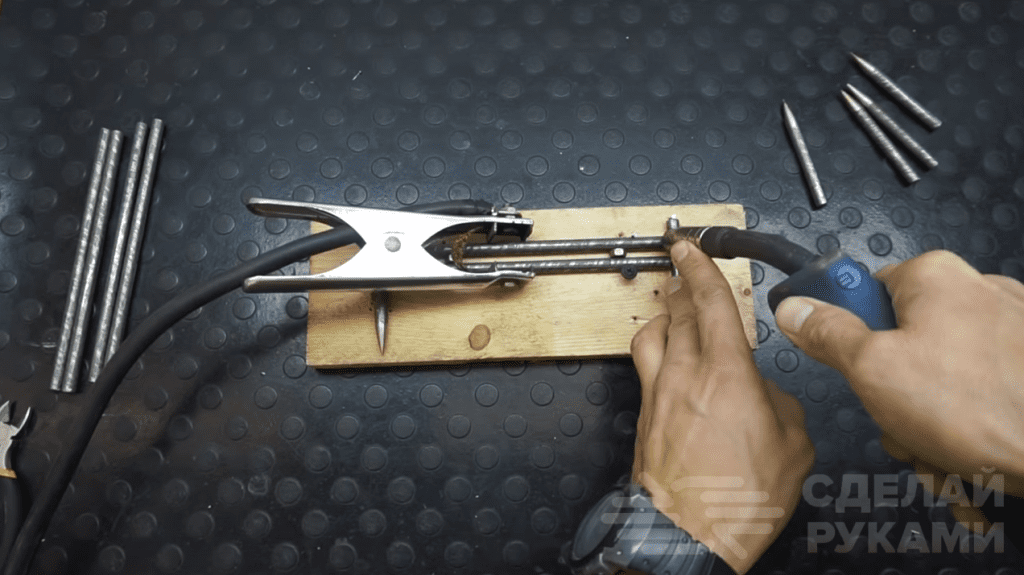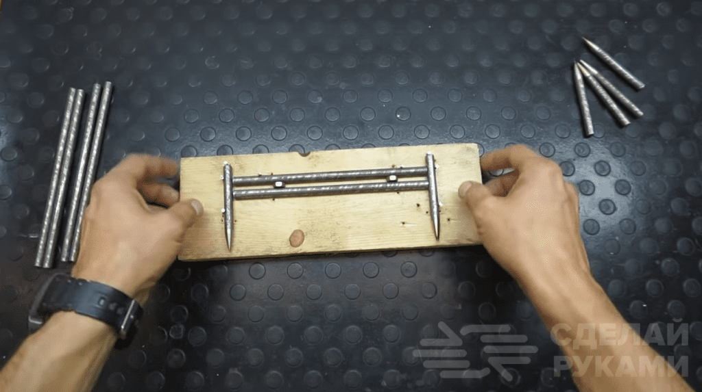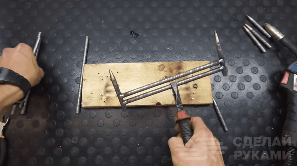 Короткие заготовки необходимо зажать в патроне электродрели или шуруповерта, и заострить на наждачном станке. Затем делаем три скобы. На каждую скобу потребуется два длинных прутка и два «коротыша». Свариваем их между собой — для этого можно собрать простенький кондуктор.