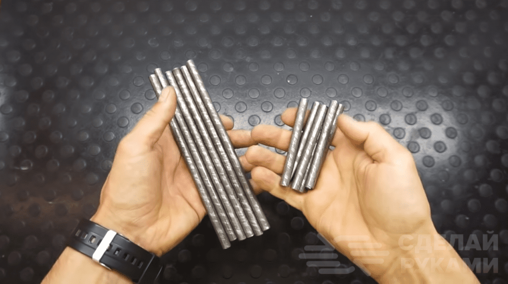 Для данной самоделки потребуется круглый стальной прут диаметром примерно 8–10 мм. Можно также и арматуру использовать или квадрат. Берем болгарку и отрезаем шесть кусков длиной по 8 см и шесть отрезков — по 18 см. При необходимости размеры можно сделать другими.
