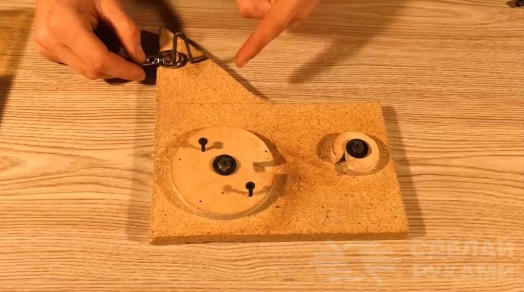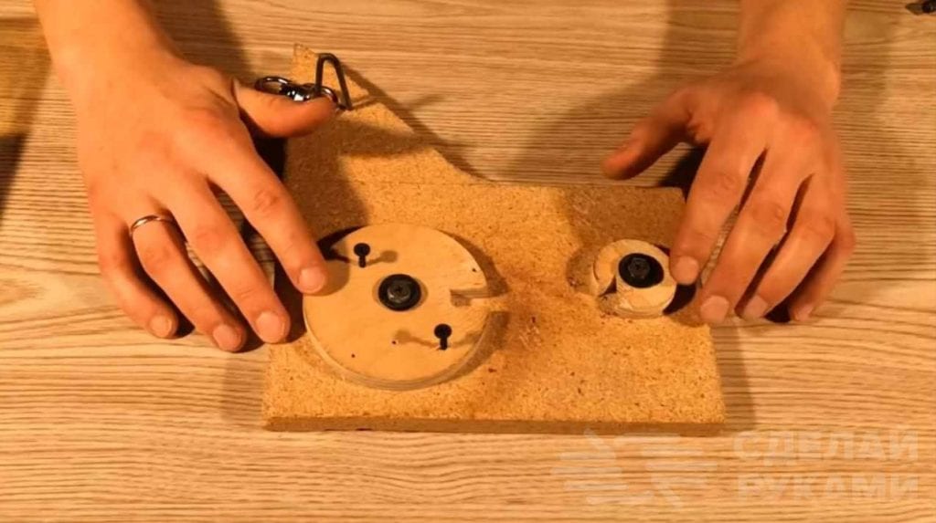 Данное приспособление представляет собой основание и два шаблона разных размеров, которые закреплены на нем. В качестве основания можно использовать ДСП, фанеру или обычный кусок от доски. В углу основания закреплен вертлюг.