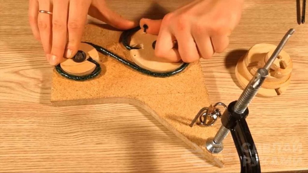 Основание крепится к столу при помощи струбцины. Также можно и на саморезы прикрутить. Один круг из фанеры закреплен на основании неподвижно, а второй (большего диаметра) – подвижный. Это нужно для того, чтобы можно было натянуть край прутка.