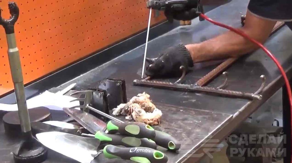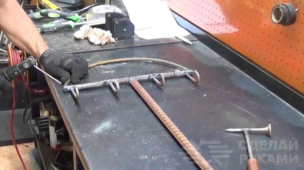 Из них автор делает крючки (гнет с помощью трубы, зажав их в тисках), и приваривает к верхней части стойки.