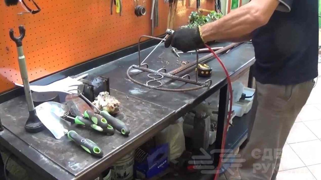 После этого автор отрезает еще один кусок арматуры и сгибает его дугой. Заготовку привариваем к перекладине стойки.