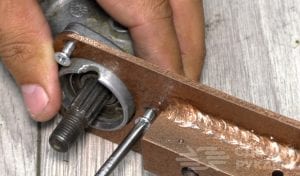 Установка ведущей звёздочки осуществляется при помощи стандартных деталей бензотриммера. Просто вместо заводского диска с леской устанавливается сама звездочка и притягивается родной гайкой. Резьба здесь обратная, поэтому самопроизвольного откручивания не будет.