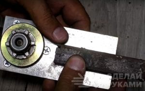 Также нужно будет изготовить переходную пластину для крепления шины. Расстояние между шайбой и корпусом редуктора триммера составляет 5 мм, поэтому пластину будем делать из металла 4 мм, чтобы оставить зазор.