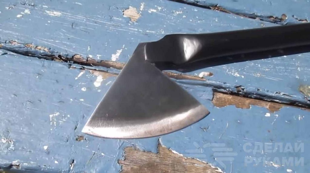 На последнем этапе мастер выполняет заточку лезвия. Подробно о том, как сделать топор из куска пильного диска и стальной трубы, смотрите в видеоролике на нашем сайте.