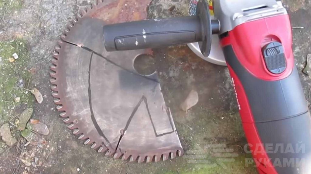 Первым делом необходимо зачистить пильный диск от ржавчины. Потом рисуем контуры топора, и вырезаем заготовку при помощи болгарки (УШМ). Обрабатываем ее на гриндере или лепестковым кругом.