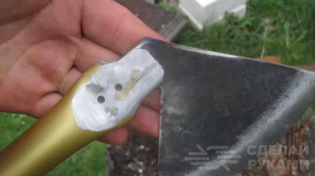 Один край нужно расплющить, предварительно сделав прорезь угловой шлифмашинкой. Потом надо просверлить три отверстия. Вставляем топор в ручку и фиксируем на заклепки.