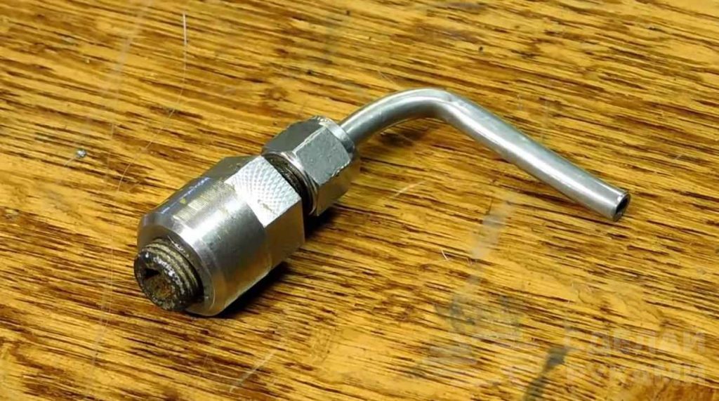 На следующем этапе потребуется отрезок трубки диаметром около 6 мм, который согнут под углом 90 градусов, а также сгонная гайка, муфта с внутренней и наружной резьбой и заглушка. Все детали собираем вместе.