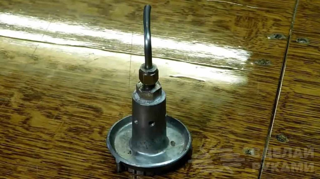 Потом на трубку надевается шланг, который через переходник подключается к газовому баллончику. В верхние отверстия в корпусе фильтра вставляются болты, на которые надеты втулки — на них будет стоять посуда. Сбоку прикручивается ручка от болгарки.