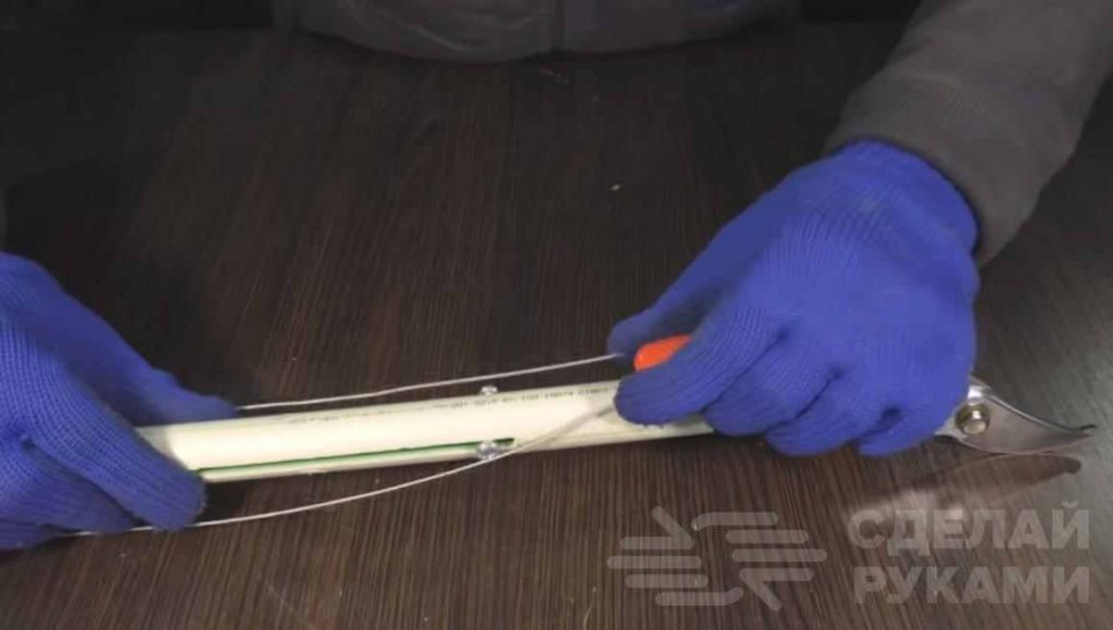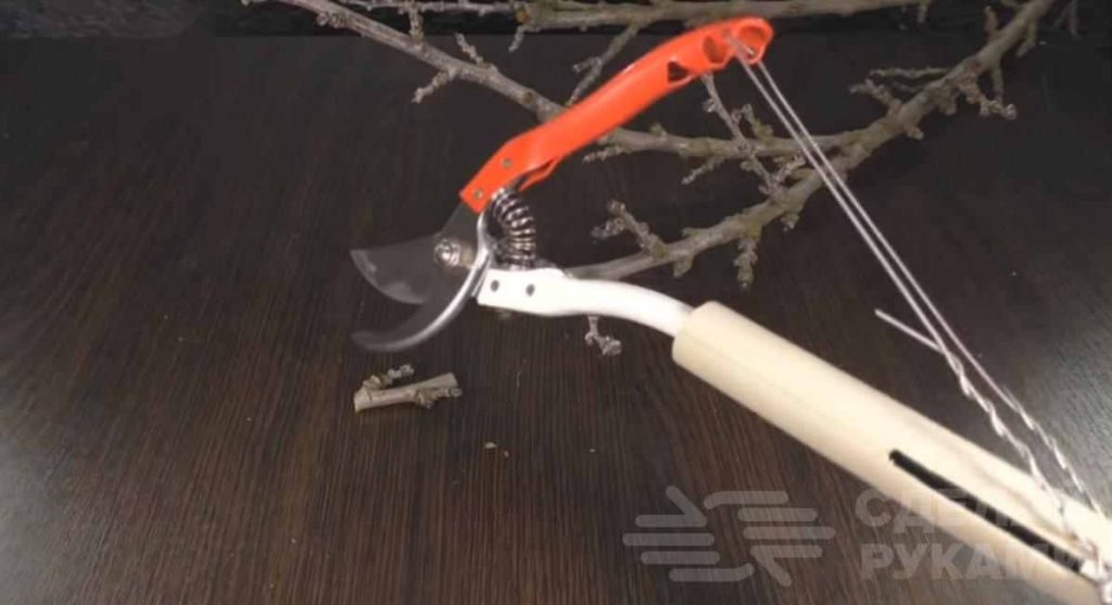 Далее одну ручку садового секатора вставляем в полипропиленовую трубу, а ко второй — прикручиваем стальную проволоку. Концы проволоки надо будет закрепить на болтиках, которые вкручены в отверстия в удлиненной гайке.