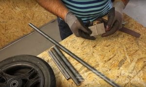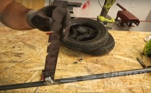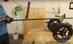 Для данной самоделки потребуются: два колеса, небольшой кусок профильной трубы, стальной пруток круглого сечения, полоса металла и две пластины, а также крепежные элементы — две шпильки с гайками и болт с барашковой гайкой.