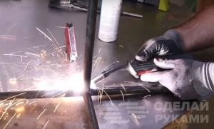К длинному стальному прутку привариваем ручку из отрезка квадратной профильной трубы. В стальных пластинах и полосе сверлим отверстия и соединяем их вместе при помощи болта с барашковой гайкой. Получившиеся «уши» привариваем к стальному прутку. Также при помощи сварки крепим к нижней части прутка две вертикальных стойки под углом 45 градусов, по краям которых привариваем шпильки с гайками.