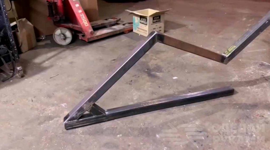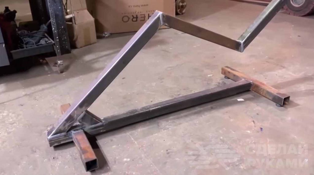 Для большей устойчивости конструкции на земле или бетонной поверхности к нижней части каркаса автор приваривает три «лапы» из профильной трубы: два отрезка по бокам и еще один кусок — с торца основания.
