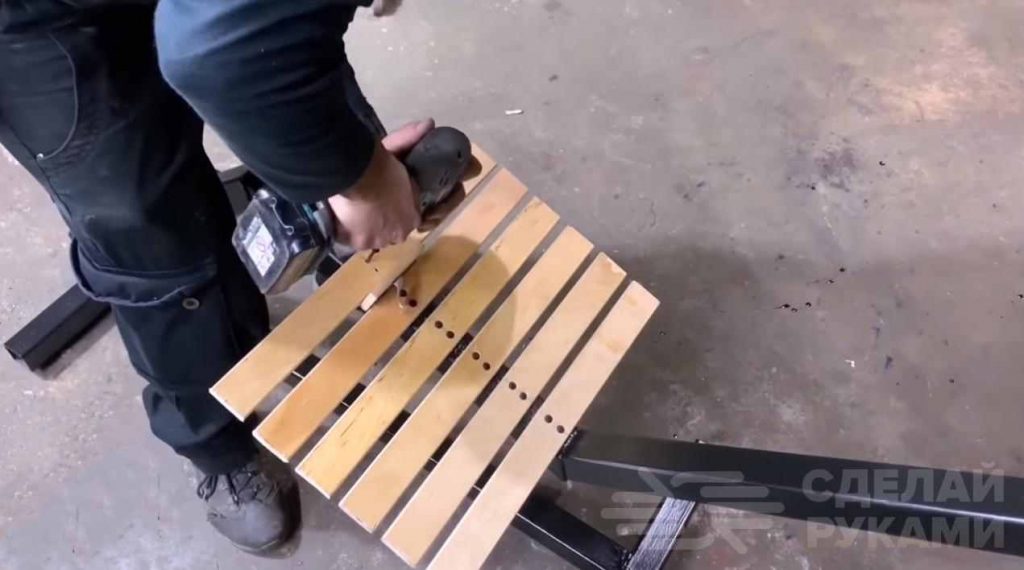 На следующем этапе работ поверхность профильной трубы надо зачистить болгаркой, обезжирить и покрасить. Далее необходимо напилить деревянные рейки подходящего размера и прикрутить их к профилю.