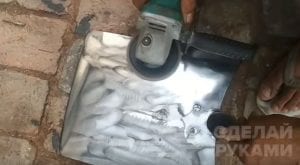 От листа нержавейки отрезаем кусок прямоугольной формы нужного вам размера. Размечаем поверхность, и с одной стороны делаем болгаркой полукруглый вырез. Затем прокатываем лист на листогибочном станке, чтобы придать заготовке вогнутую форму. Далее необходимо сделать разметку для крепления насадки под деревянный держак.