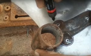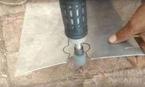 Края листа обрабатываем болгаркой, чтобы убрать заусенцы. После этого надо закрепить на заклепки насадку под черенок, предварительно просверлив три отверстия. На последнем этапе работ, используя болгарку, необходимо слегка закруглить кря и сделать небольшую режущую кромку, чтобы лучше «вгрызаться» в грунт.